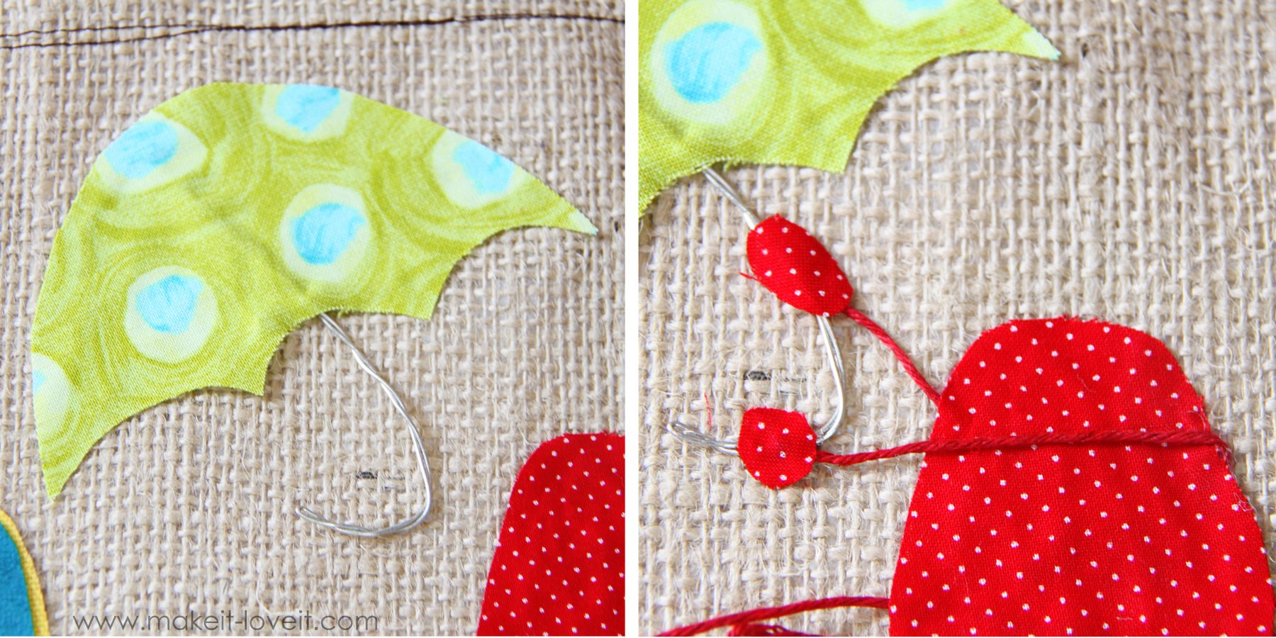 Now, cut out some shapes to create the water spout. Then add a few stitches for detail. (The yellow fabric is duck cloth and the blue is faux leather.)
