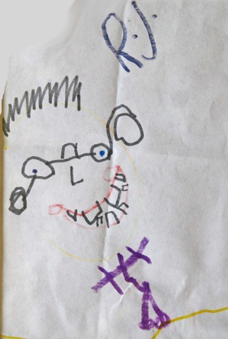 The portrayal of David is childlike, wild, and his pointy teeth resemble my own son’s self portrait.